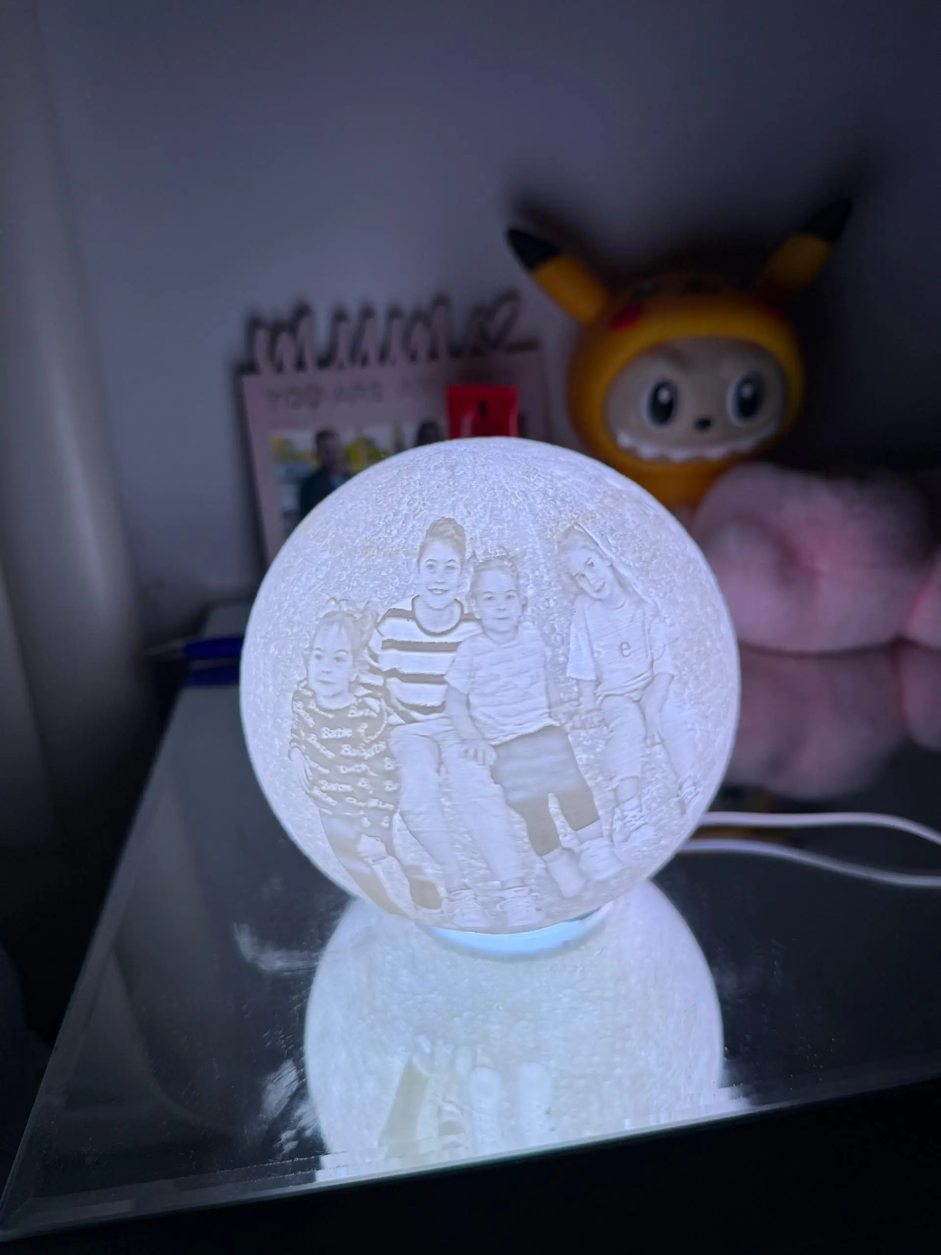 Faites graver votre photo, nom, date ou message spécial directement sur la lampe pour créer un objet unique, chargé d’émotion et de charme. Sa lumière douce et chaleureuse apporte une atmosphère magique à la chambre, au salon ou à une table de nuit.